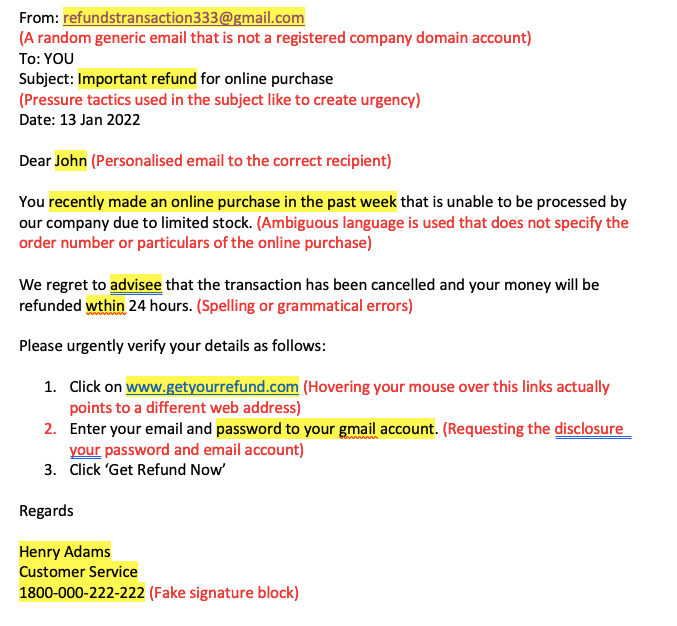 - Pay attention to the details in the email’s content. Can you identify any of the indicators? E.g. Spelling errors, general statements or random email addresses.
